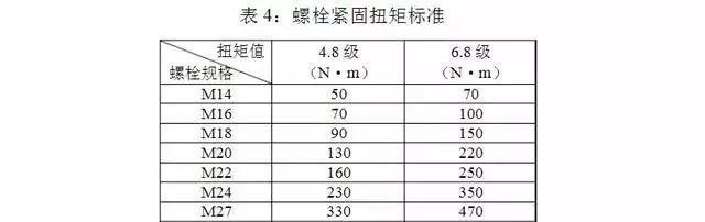 連接螺栓應(yīng)逐個緊固,螺栓的扭緊力矩不應(yīng)小于表 4 的規(guī)定。若發(fā)現(xiàn)螺桿與螺母的螺紋有滑牙或螺母的棱角磨損以致扳手打滑的,應(yīng)更換螺栓、螺母。